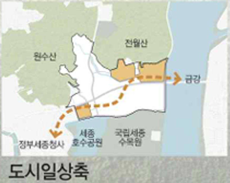 세종청사와 금강을 잇는 황토색 점선이 무엇을 의미할까. 이것은 가운데 뻗은 절재로(회색 도로)와는 눈으로도 구분된다. 특히 그 점선이 따라가는 지역에 황토색 면이 3곳이 있는데, 이것은 위에서 설명한 주요 상업지역과 문화 인프라 집적 예상 지역과 정확히 일치한다.