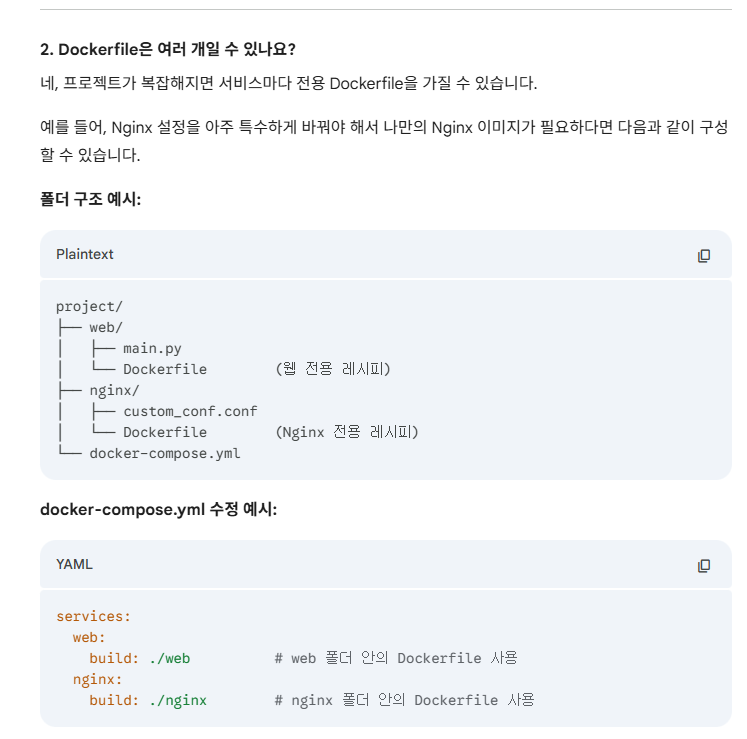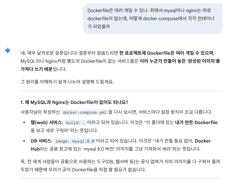 나는 web에 대해서만 Dockerfile을 작성했다. 그래서 Dockerfile이 한 개 뿐인데, 어떻게 docker-compose.yml 실행 결과 여러 개의 컨테이너가 생길 수 있을까.