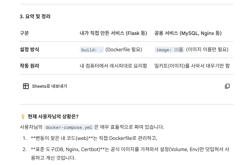 참고로, sejongview 서버의 docker-compose.yml의 일부는 아래와 같다. (위 설명처럼 mysql은 'image:'으로 되어 있고, web은 'build: .'으로 되어 있다)